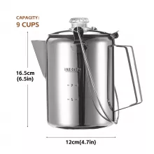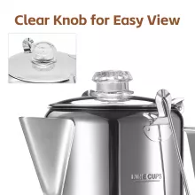 Designed for campfires, stovetops, and everything in between, this percolator lets you enjoy a hearty cup of coffee the traditional way. The clear knob on the lid helps you monitor the brewing process, so you can make your coffee as strong as you like it. From weekend getaways to early morning routines, this coffee maker brings warmth, comfort, and bold flavor to every cup.