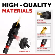 Upgrade your toolkit with this 12-piece Countersink Drill Bit Set, designed for flawless woodworking results. Whether you’re assembling furniture, working on cabinetry, installing doors, or tackling DIY projects, this set delivers smooth, professional finishes every time. Built from high-speed steel with a titanium coating, these bits stay sharp longer, cut cleaner, and resist wear even under frequent use. With a smart all-in-one design, you can drill, countersink, and counterbore in one seamless step—saving both time and effort.