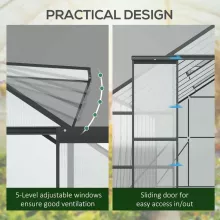 Constructed with a heavy-duty aluminum frame and galvanized steel base, this greenhouse offers exceptional stability and rust resistance. The translucent polycarbonate panels effectively retain heat and protect plants from harmful UV rays, while still allowing ample sunlight to filter through. Built to withstand the elements, it ensures your plants are safe and thriving, no matter the weather.