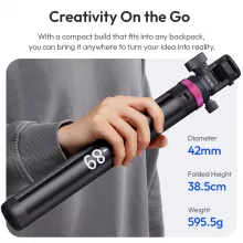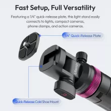 With its quick release 1/4” QR plate and cold shoe mount, this stand gives you the freedom to attach a wide range of devices. Easily mount your DSLR camera, microphone, LED light, or video accessories in seconds, saving you valuable setup time. The extendable height ranges from a compact 15 in when folded to an impressive 82 in when fully extended, making it suitable for everything from tabletop recording to overhead lighting setups. Its lightweight build makes it easy to pack, carry, and set up anywhere you go.