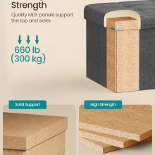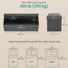 This ottoman is built for convenience and durability. Its foldable design allows for quick assembly in seconds—just insert the bottom panel, and it’s ready to use. When not in use, simply fold it flat to store under the bed or in a closet. Measuring 15″D x 43″W x 15″H, it provides a generous 35-gallon storage capacity. A removable divider helps keep blankets, clothes, toys, or books organized. Constructed with sturdy MDF panels and reinforced metal corner guards, it supports up to 660 lbs, making it reliable for both storage and seating.