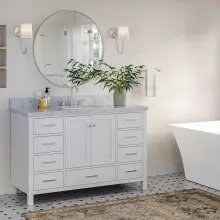 Transform your bathroom into a luxurious retreat with this exquisite 55″ white bathroom vanity. Designed to combine functionality with a sophisticated aesthetic, this vanity is the perfect centerpiece for any modern or classic bathroom. Its clean white finish, complemented by a premium Italian Carrara marble countertop, exudes timeless elegance and refinement.