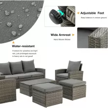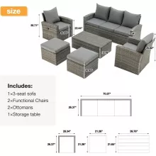 Elevate your outdoor living experience with this 6-piece patio furniture set, designed for comfort, style, and versatility. Featuring a modular sectional sofa, a functional ottoman, and a coffee table with built-in storage, this set brings sophistication and practicality to your garden, patio, or backyard. Crafted with high-quality materials and a chic vintage gray wicker design, this set ensures lasting beauty and durability for your outdoor retreat.