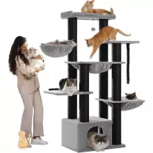 This 67-inch tall cat tree is specially designed for large adult cats, including breeds like Maine Coons and Ragdolls. With its oversized platforms, roomy condo, and extra-large hammock, it can comfortably accommodate up to 5-6 big cats weighing up to 25 pounds each. Featuring 13 extra-thick 4.3-inch scratching posts, it provides a safe and fun space for climbing, scratching, and lounging while protecting your furniture from claw damage.