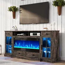 This TV stand is not just a piece of furniture; it’s a lifestyle upgrade. The integrated fireplace delivers a cozy warmth, while the LED lights allow you to create a vibrant or relaxing atmosphere depending on the mood. Whether you’re setting up a modern entertainment center or adding character to a rustic-themed room, this unit fits the bill perfectly. Its thoughtful design includes cable management holes to keep your space neat and tidy, making it as practical as it is beautiful.