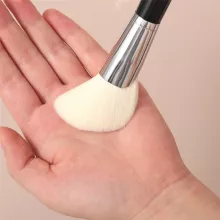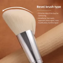 Crafted from ultra-soft nano synthetic bristles, this brush is not only gentle on the skin but also incredibly effective at picking up and distributing powder evenly. The unique angled design allows you to effortlessly contour your face, enhancing your natural features with precision and control. Its long, ergonomic wooden handle ensures a comfortable grip, making it easy to apply makeup with confidence.