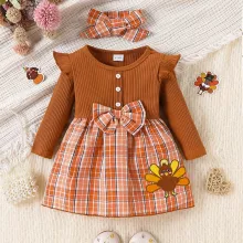 - Design: Long-sleeved plaid dress with bow decoration
