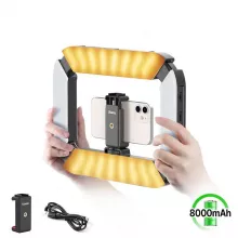Built for both beginners and professionals, this ring light rig combines advanced lighting technology with user-friendly design. The frosted diffuser delivers soft, flattering light, while the four-sided construction makes it easy to hold or mount. The built-in 8000mAh rechargeable battery keeps you shooting for hours, so you’ll never miss the perfect moment. With three cold shoe mounts on top, you can attach microphones, extra lights, or a handle to build your ideal setup.