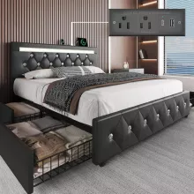Say goodbye to clutter with four spacious sliding drawers built into the base. These drawers glide smoothly on wheels and feature locking holes to keep them securely in place, making it easy to store blankets, bedding, and off-season clothing. Integrated USB, Type-C, and standard outlets on the headboard keep your devices charged and within reach—perfect for a seamless blend of comfort and technology.