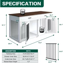 Combine practicality and style with this 74.8″ Furniture-Style Dog Crate. Designed for medium to large dogs, this versatile kennel is more than just a comfortable space for your pets—it’s a stylish addition to your home. Featuring a removable divider, built-in drawers, and a sturdy tabletop, it’s perfect for pet owners who want their dog crate to blend seamlessly with their decor. Whether you use it as a dual dog kennel, a TV stand, or a storage solution, this multi-functional piece is a must-have for modern living.