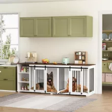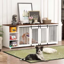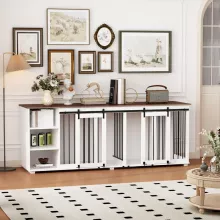 Upgrade your pet’s living space with this beautifully crafted 86.6″ wooden dog crate furniture. Combining modern style with practical functionality, this kennel offers a secure, spacious shelter for your pets while enhancing the aesthetics of your home. Designed with durable materials and thoughtful features, it serves as a versatile piece of furniture that doubles as a TV stand, sideboard, or storage unit.