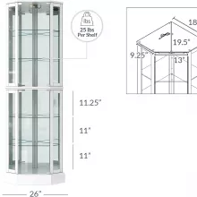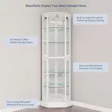 Enhance your home with a touch of sophistication and functionality with this Lighted Glass Display Curio Cabinet. Designed to showcase your cherished items in style, this stunning cabinet features tempered glass doors and shelves, a mirrored back panel, and a built-in light to illuminate your treasures. Its curved wood corner design in a crisp white finish effortlessly blends into any decor, making it a perfect fit for home bars, dining rooms, or living spaces.