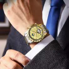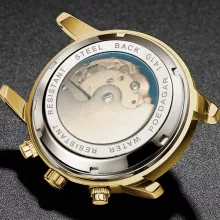 Designed for both elegance and functionality, this mechanical wristwatch is crafted with meticulous detail. Its automatic self-wind movement keeps time accurately without the need for batteries, while the luminous hands and markers ensure visibility even in the dark. With a stainless steel band, sapphire crystal glass, and water resistance up to 100 feet (3 Bar), this watch is as durable as it is stylish. A complete calendar display with both date and week adds practicality to its luxury appeal.
