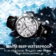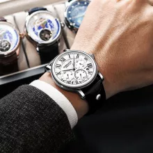 Unlike ordinary watches, this piece is designed for the modern business man who values sophistication without sacrificing function. Its luminous dial ensures clarity even in low light, while the chronograph and calendar features make it highly practical. The elegant leather band and Roman numeral display bring a refined, classic look that suits formal business attire as well as smart-casual outfits. Whether you’re at a board meeting, attending an evening event, or traveling, this watch delivers both style and reliability.