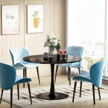 The dining table features a durable MDF tabletop with a smooth, polished edge that ensures a refined touch. The sturdy metal pedestal base offers exceptional stability and support, making it as reliable as it is stylish. Its compact yet robust design supports up to 250 lbs, ensuring long-lasting use for your everyday needs.