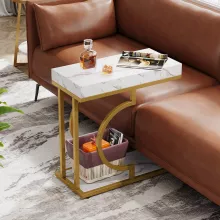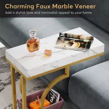 Add a touch of modern elegance to your home with this stunning white and gold C shaped side table. Designed with a sleek semicircular gold frame and a chic faux marble top, this narrow end table is perfect for elevating the style of any space. Its compact size and sophisticated design make it an ideal addition to your living room, bedroom, or reading nook.