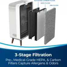 - 3-Stage Filtration System: Includes a fabric pre-filter, activated carbon filter, and a medical-grade H13 HEPA filter, designed to trap large particles and fine airborne pollutants, as well as home and pet odors.