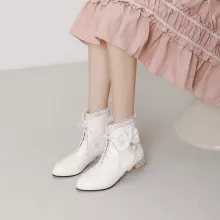 The charming butterfly knot detail adds a feminine flair, while the classic lace-up design ensures a secure fit. The 1.2-inch (3 cm) square block heel gives you just the right amount of lift without sacrificing comfort, making them perfect for walking, shopping, or social gatherings. The rubber outsole provides reliable grip, so you can step with confidence on different surfaces. With a shaft height just above the ankle, these boots flatter your legs and pair beautifully with dresses, skirts, or jeans.