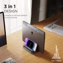 Transform your workspace with this sleek and functional vertical laptop and phone stand. Designed to hold your laptop, tablet, and phone in one convenient place, it helps you create a clean, clutter-free desk setup while keeping your devices secure and within reach. With its modern design and sturdy build, this stand not only saves space but also adds a touch of sophistication to your desk.