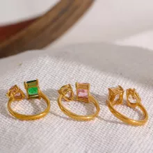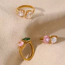 Discover the perfect blend of elegance and versatility with our Waterproof Adjustable Open Ring, featuring stunning pink and green cubic zirconia stones. This exquisite piece of jewelry is designed to make a statement, whether you’re dressing up for a special occasion or adding a touch of sparkle to your everyday look. Crafted from high-quality stainless steel and plated with real gold using PVD technology, this ring promises durability and a lasting shine.